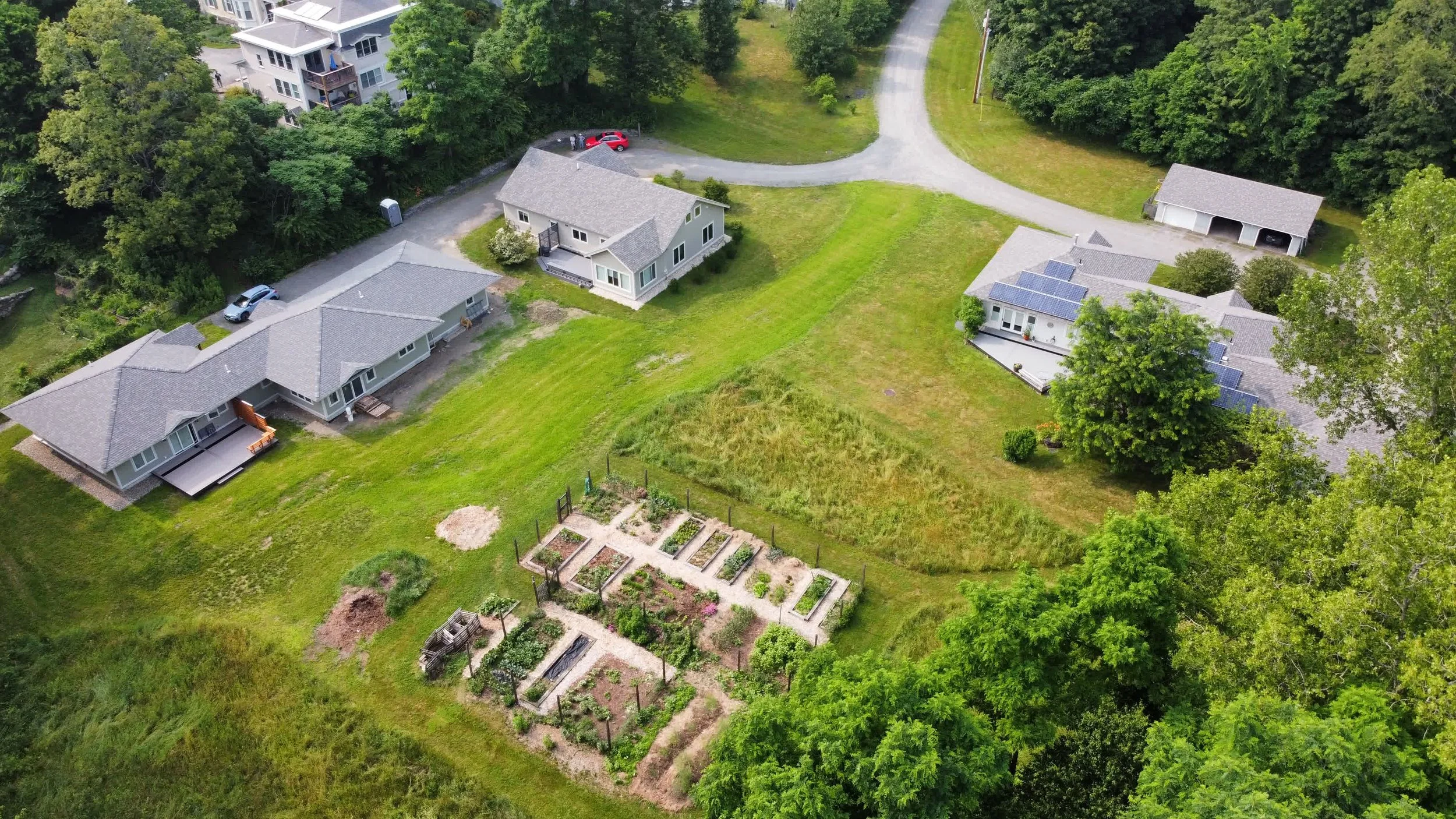 The initial six homes were built in 2007-2008, a seventh in 2015, an eighth in 2022, and we expect our ninth and final house to be complete in 2023. The location of our units was planned to maximize the wildness of our remaining eight acres. Each home’s interior is owner designed. All are single story, super-insulated, and have 5-Star plus energy ratings. The clustered homes have external walls composed of 6″ SIPS (structurally insulated panels) and a shared firewall in a link room, about 8’ x 10’. Current homes use this space in a variety of ways: for a study, a laundry room, instant hot water and HRV ventilation system area, or as a large walk-in closet/storage area. Sources of heat vary – radiant heat floors, electricity, propane – but do not include wood burning. Four homes have added photo-voltaic panels on their roofs, a fifth belongs to a solar farm. Two units are fully electric and use heat pump technology.